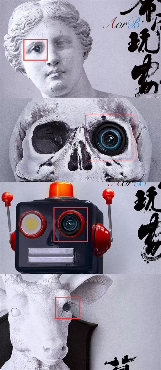 前期海报,分别是四组不相关的物体,维纳斯、骷髅头、机器人、鹿首级,但再看仔细,你会发现,这四组物体的一只眼睛,都被换成了“摄像头”。