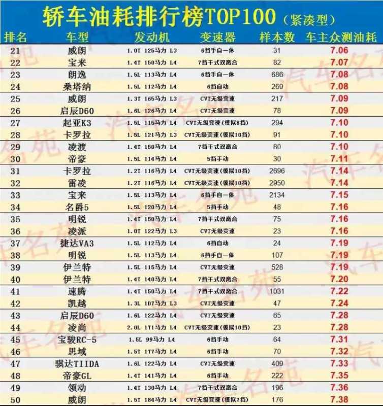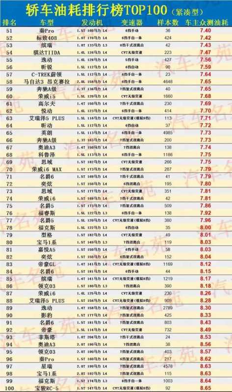 汽车油耗排行榜(轿车油耗公布|排名第1~100位)