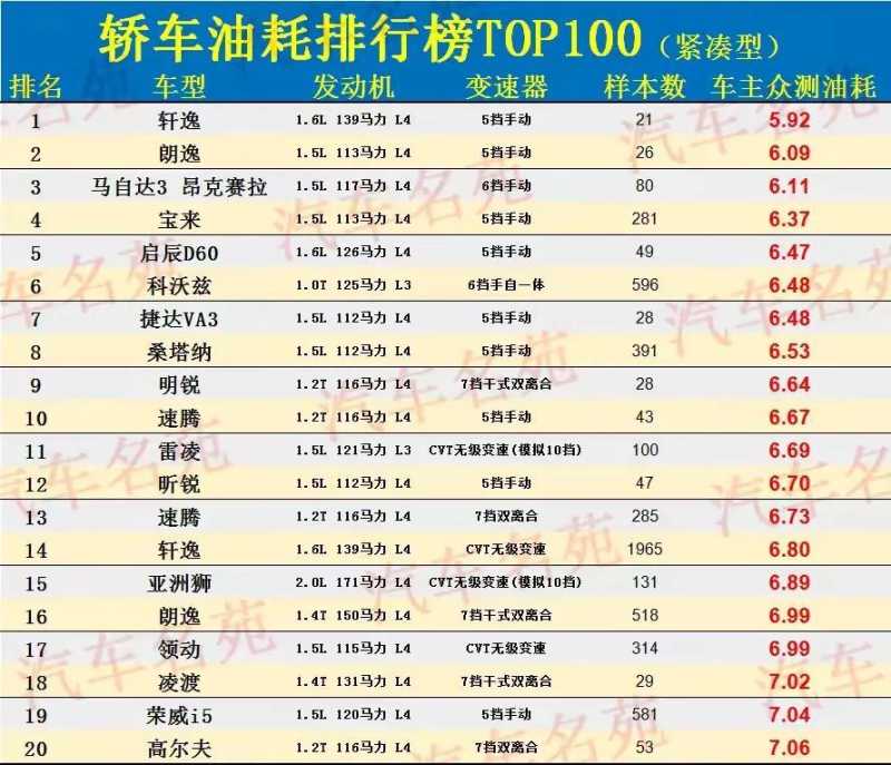 随着国内购车人群的不断增加,摆在大家面前就出现了一个很现实的问题。“买车容易养车难”,毕竟谁的钱都不是大风刮来的,所以大家买车之前都会留意一下车型的油耗表现。这是紧凑型轿车油耗排名第1~100位。(这些都是车主实测后的平均油耗,跟个人表显油耗可能有稍许误差)