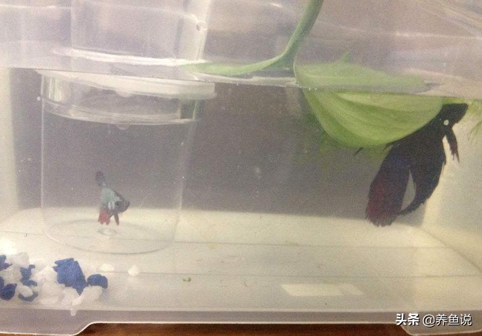 然后我们先提前将公鱼放入缸内让他熟悉一下环境,差不多2天后用隔离盒将母鱼放进去,让他们隔着隔离盒“打斗”。其实不算是打斗,可能两方都会展鳍竖鳃,这是本能表现。
