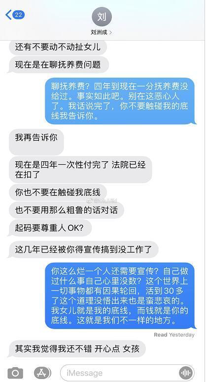 然而更过分的就是,从林苗晒出的短信记录来看,刘洲成嘴上说会给女儿抚养费,但拖了整整四年的时间,就是分文未给,还强行把女儿搬出来作为自己的挡箭牌,说女儿是他的底线,警告林苗不要触碰,但搞笑的就是,就是没有见到一分钱的抚养费。
