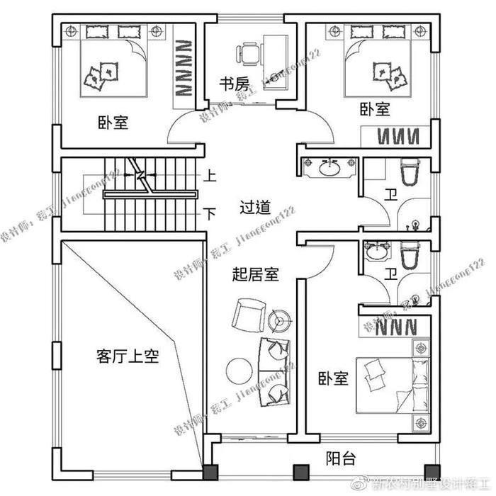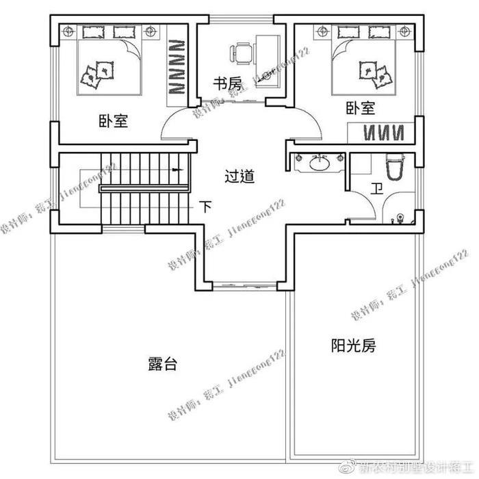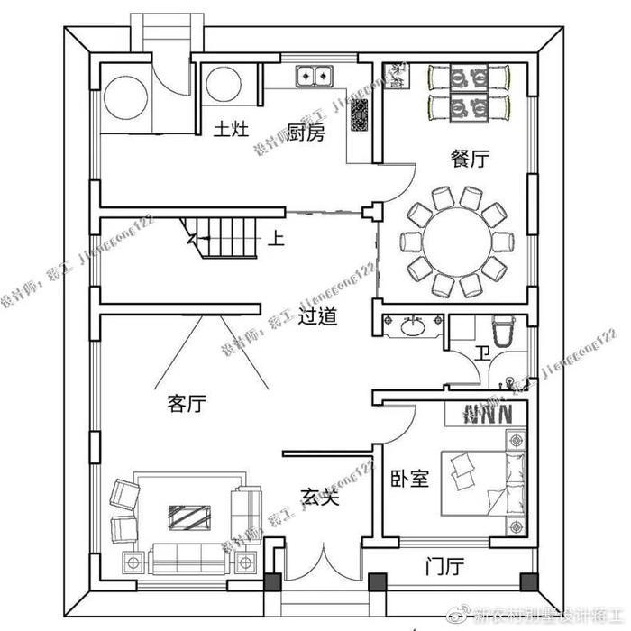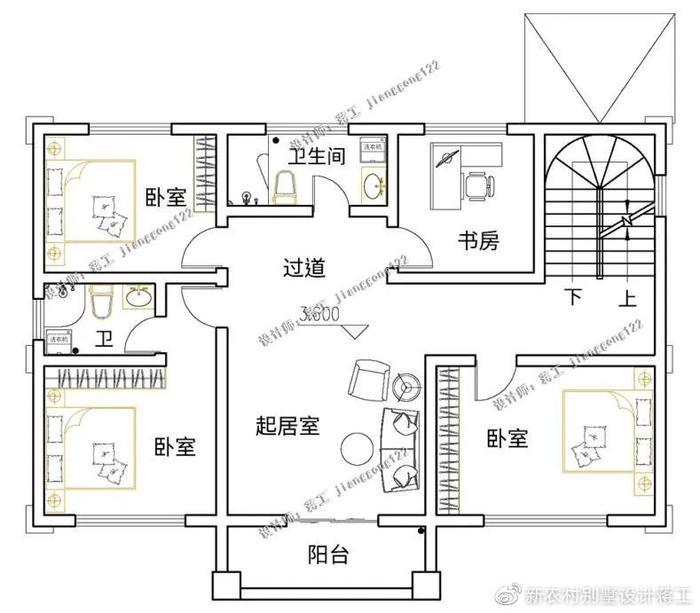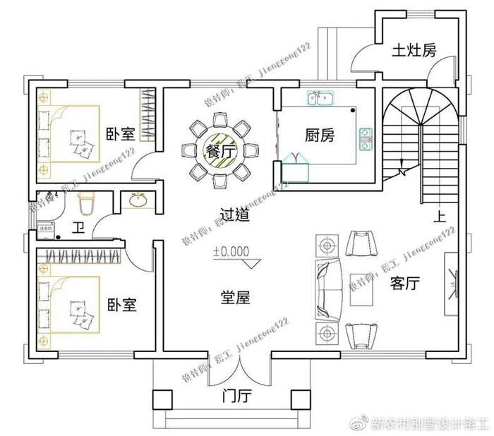 别墅外观大气实用,大胆的外观配色巧妙地增加了整体的美感,阳光房的设计让整栋别墅耳目一新,多窗的设计充分考虑别墅的采光和通风性能。灰色坡屋顶错落有致,适合农村自建。一层采用东西动静分区设计,东侧设计餐厨、客厅,布局通透,面积开阔,动线流畅;东侧部分设计为两间卧室+卫生间,方便日常起居使用;北侧还设置有独立的土灶房,符合农村日常生活所需;二楼为家人的休息空间,布置了三间卧室和一间书房,家中成员都能拥有自己的私享空间。三楼以娱乐待客功能为主,设置棋牌室、阳光房,大大提升室内休闲功能。