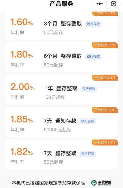 1、从第三方平台存款页面点进去之后,我们会发现原来直接进入了银行的小程序,里面有各种存款产品选择(都是正常存款利率),有存款保险标识,并按国家规定参加存款保险;