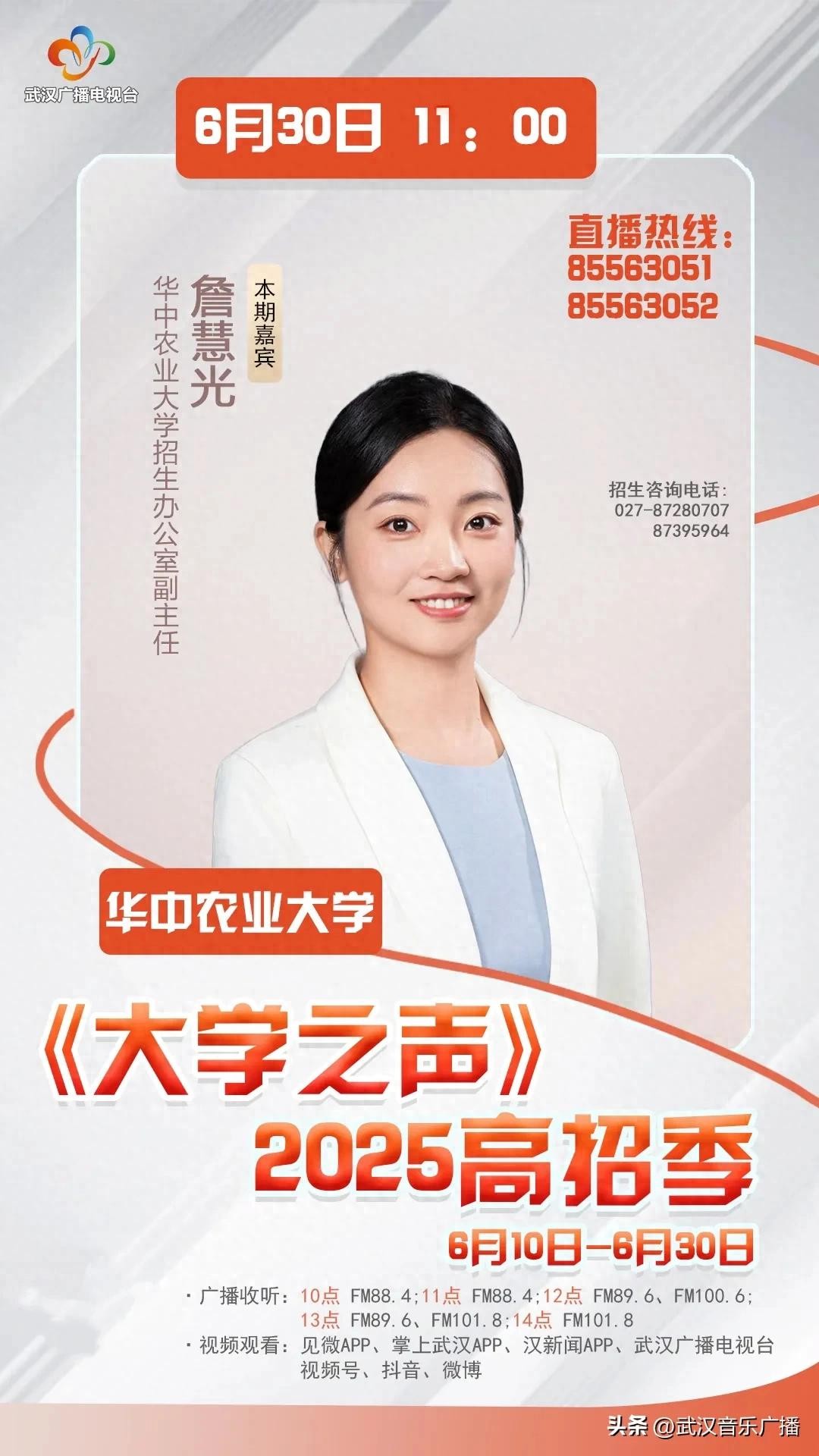 【武汉广播电视台《大学之声》#2025高招季#】6月30日上线高校@华中农业大学 @湖北大学 热门王牌专业稳扎根基、冷门宝藏专业暗藏机遇、前沿科技赛道抢跑未来。权威政策深度解码、志愿攻略贴心制导、锁定直播间,填报志愿不迷茫。#高考成绩#