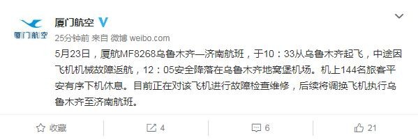 齐鲁网5月23日讯5月23日13:20,据厦门航空官方微信公布:5月23日,厦航MF8268乌鲁木齐—济南航班,于10:33从乌鲁木齐起飞,中途因飞机机械故障返航,12:05安全降落在乌鲁木齐地窝堡机场。机上144名旅客平安有序下机休息。目前正在对该飞机进行故障检查维修,后续将调换飞机执行乌鲁木齐至济南航班。