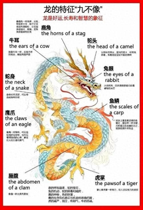 中华龙是由九种动物图腾组成的,骆驼兔子,梅花鹿,蛇,蜃,虎,鹰,牛。