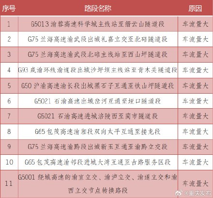9月29日,重庆高速公路迎来出行高峰,重庆交巡警总队整理了中心城区片区高速公路出行提示,9月30日-10月2日7时至14时高速公路出城方向易发生拥堵。请广大交通参与者合理选择出行时间、出行线路、出行方式,错峰避堵出行。@重庆交巡警
