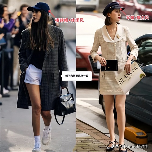 休闲的棒球帽配上同样休闲的卫衣、小白鞋,轻松拿捏美式街头风。军帽的复古感邂逅小香风套装的优雅,同样也能穿出格调。