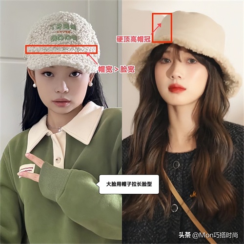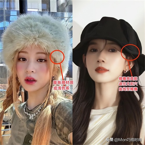 帽子的毛绒、羊羔绒、粗针织等膨胀感材质或浅色系都有填充太阳穴的效果。还可以选择能遮住太阳穴的帽檐宽度,配合曲线型帽檐重新让脸型变得流畅!