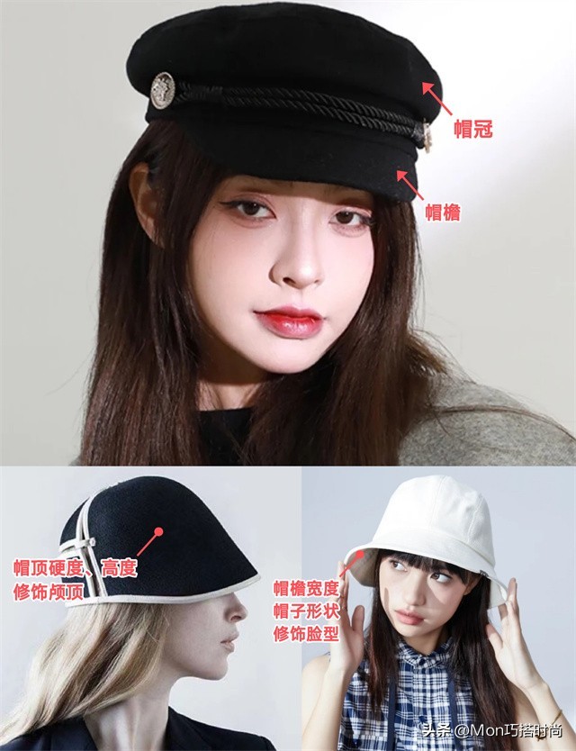 帽子主要由帽冠和帽檐这两部分构成,用帽子修饰脸型,主要靠的便是帽冠的硬度、高度和帽檐的宽度、形状。