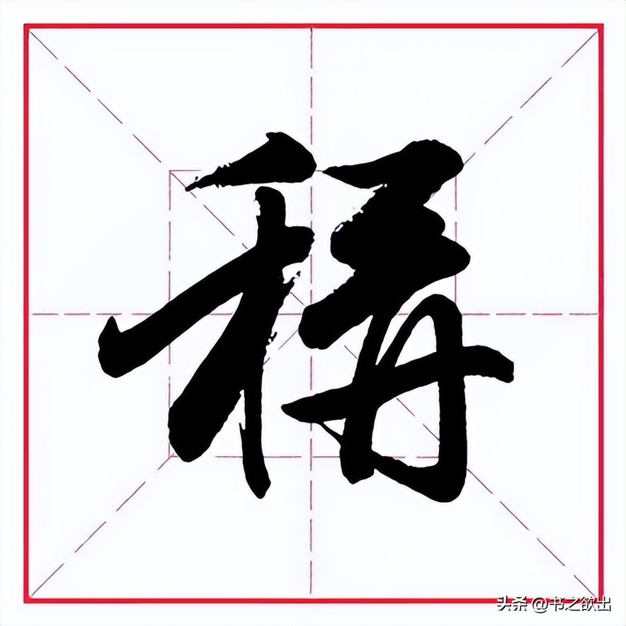 左边“禾字旁”勿宽,首撇斜切落笔,然后转锋向左快速撇出,短促有力,角度略平;横画起笔左探,向右大抗肩,右部勿长;竖笔位于首撇的中心下方起笔,从横画的右部穿过,中间稍细,劲挺有力,到位后以跪笔弹锋出钩,钩身勿大;撇笔位于横与竖的交叉处从竖笔里面起笔,撇身稍直,出锋勿长;点笔位于撇与竖的分离处从竖画里面起笔,不要写大,略平。